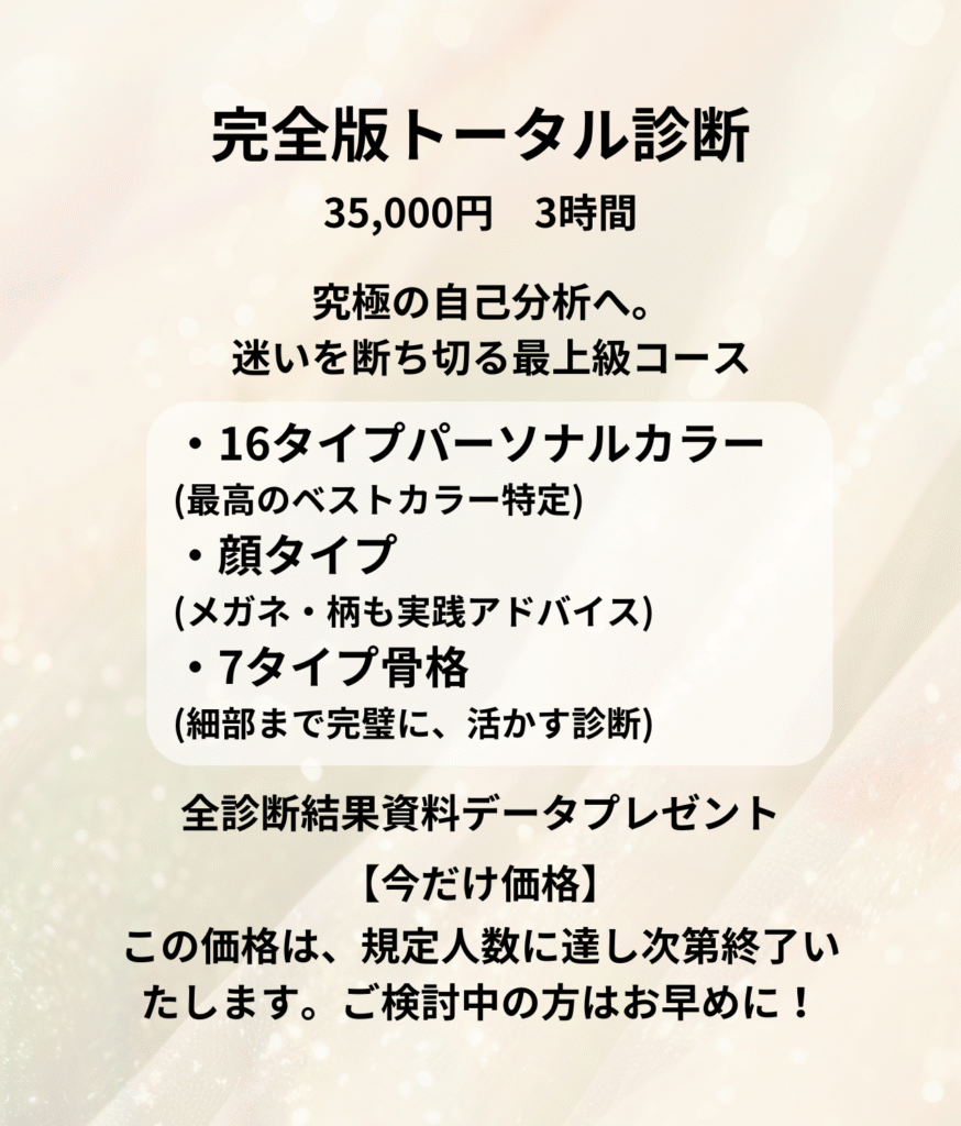 • 重要事項:顔タイプ/骨格も知りたい方は、トータル診断の方が断然お得です。
